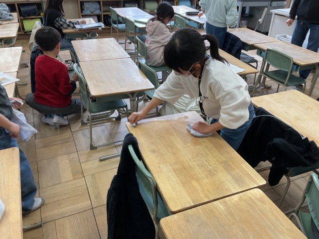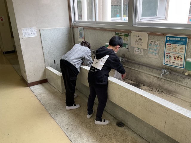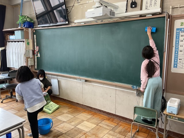 今日の午後は全校で大掃除を行いました。1年間使用した教室などを、感謝とともに次に使ってもらう人たちのために一生懸命綺麗にしました。冷たい水にも負けず、水拭きもしっかり行いました。