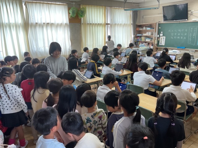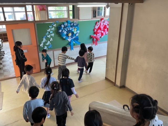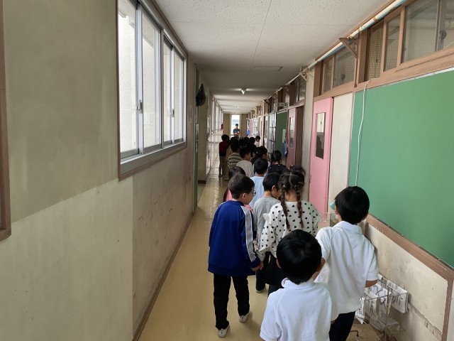 今日は番号順に並んで学校探検をしました。並び方や廊下を歩くときの約束なども確認しました。お兄さん、お姉さんの勉強の風景も見させてもらい、少しずつ学校生活に慣れていきます。