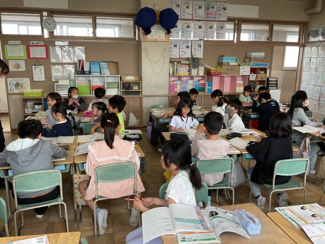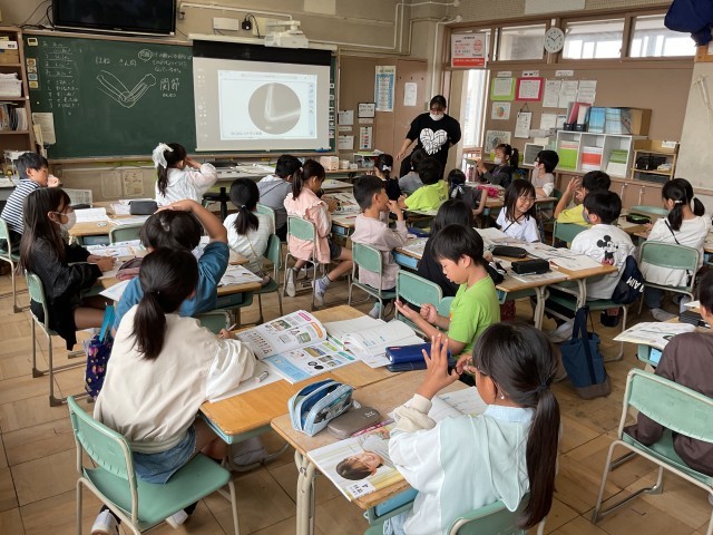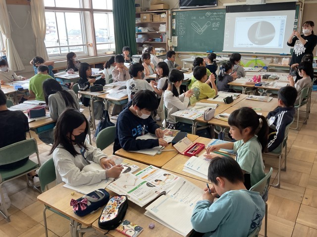 人の体はどのようにしてでき、どのように動いているのかを勉強しています。実際に自分の指や腕を触って曲がる部分はいくつあるのかを調べていました。