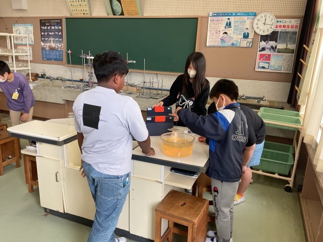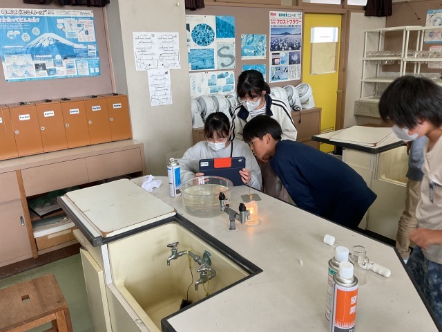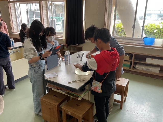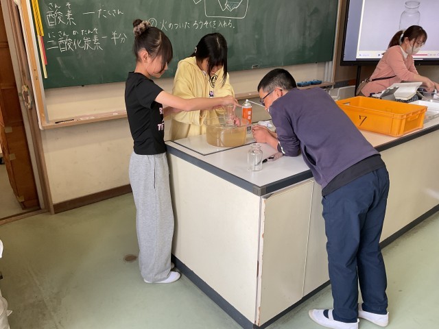 窒素、酸素、二酸化炭素の気体の中で、物を燃やす働きがある気体を調べました。水中で気体を集めることに苦労していましたが、無事実験は成功しました。