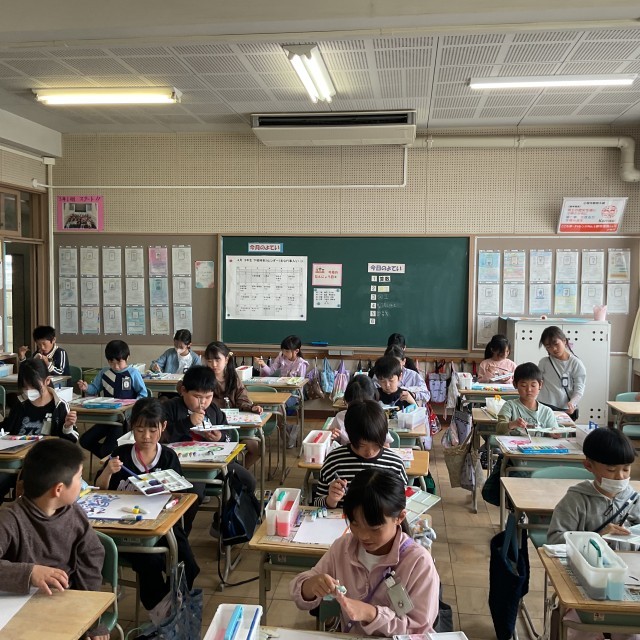 図画工作の授業で、「絵のぐ+水+ふで=いいかんじ!」を行いました。