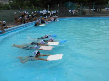 ビート板を使った伏し浮きに挑戦しました。最初、プールが苦手だった子も少しずつ水に慣れ、洗濯機では友達と渦巻きをつくり、流れに流されて楽しんでいました。
