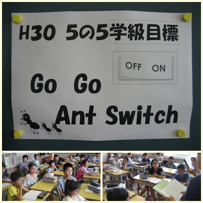 5年5組の級訓(学級目標)は、「GO GO ANT SWITCH」です。「アリ」のように協力して取り組める学級、「スイッチ」は、「オン」と「オフ」の切り替えを大切にして、個々で楽しんだりするときと、学級全体で協力したり、取り組んだりするときの切り替えができる学級をめざしていくということです。5年5組は、野外学習を通じて、「協力」という固い絆で全員が結ばれたそうです。