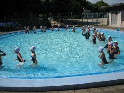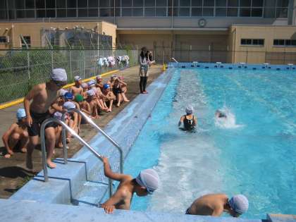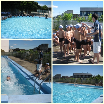 6月13日(水)今日は、朝からからっと晴れ、風はさわやかですが、日差しは強く、プール日和となりました。1時間目は、小プールでは1年生が、大プールでは、4年生が水泳指導を行っていました。4年生は、泳力をはかっていました。