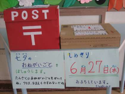 図書環境整備学校サポーターの皆さんが、七夕の短冊を用意されました。願い事を書いてくれた子には、プレゼントがあるそうです。締め切りは、6月27日(水)です。児童の皆さん、どんどん書いて下さい。名前と学年とクラスも忘れずに書いて下さい。短冊を入れるポストは、本の森の出入り口に置いてあります。どんなプレゼントがもらえるのか、非常に楽しみです。
