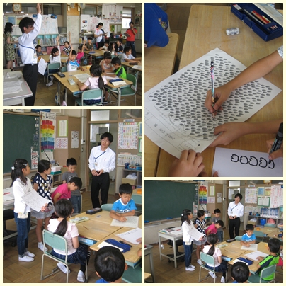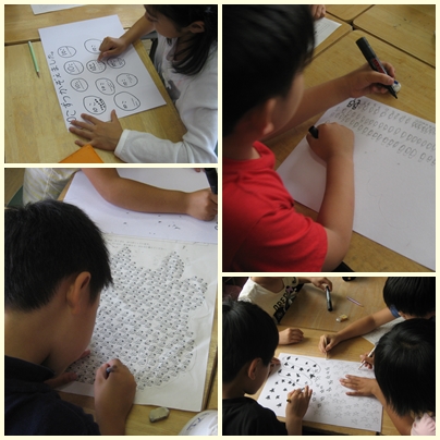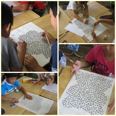 今日の授業は、数を数えるときに5個、10個、20個、50個、100個のまとまりを考えると速く、正確に数を数えることができることに気づかせ、理解することです。子どもたちは、グループでかかわり合いながら、数を数える工夫をしていました。