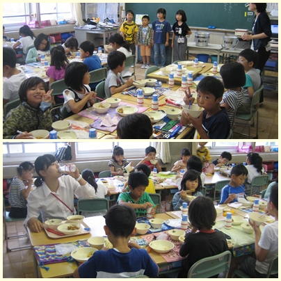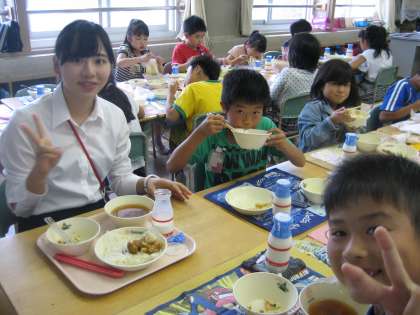 3年4組には、教育実習の先生が勉強にきています。4週間の教育実習も今週の金曜日で終わりをむかえます。教室を訪れると、子どもたちと楽しそうに給食を食べていました。