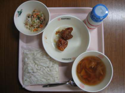 野菜きしめん・手羽先風鶏の唐揚げ・みつばとツナのサラダ・牛乳
