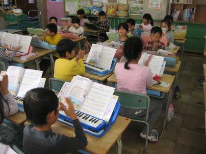 2年生が音楽の時間、「かぼちゃ」の曲の伴奏に合わせてリズム打ちをしていました。これから色々な楽器を使って合奏をしていきます。色々な音を重ねて楽しみます!