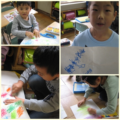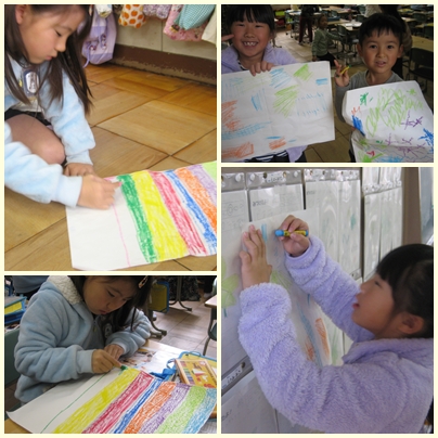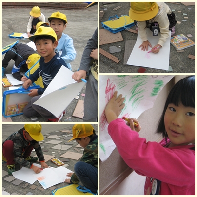 1年生が図工の授業で、でこぼこを見つけては、シャカシャカとこすり出しをしていました。おもしろい模様がたくさんできました。
