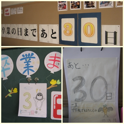 6年生の学年掲示コーナーや6年生の各学級の背面黒板や掲示コーナーには、あと30日の数字が掲げてあります。卒業まで残り少なくなってきました!