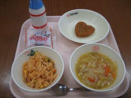 肉だんごと野菜のスープ・パンプキンコロッケ・ガトーショコラ・チキンピラフ・牛乳