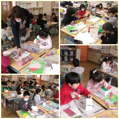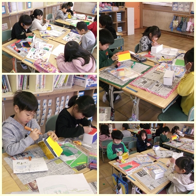 1年生が図工の授業で箱から袋がでてふくらむ作品をつくっていました。何がでてくるのかとても楽しみです!