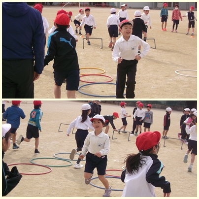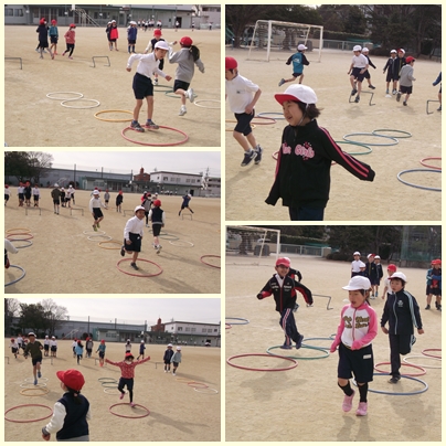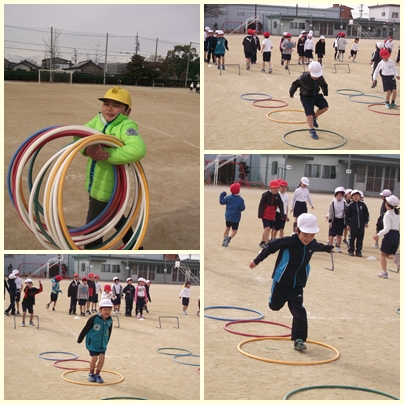 1年生が体育の授業で体づくり運動をしていました!フラフープを使ってリズミカルにとんでいました。
