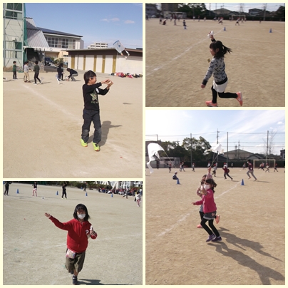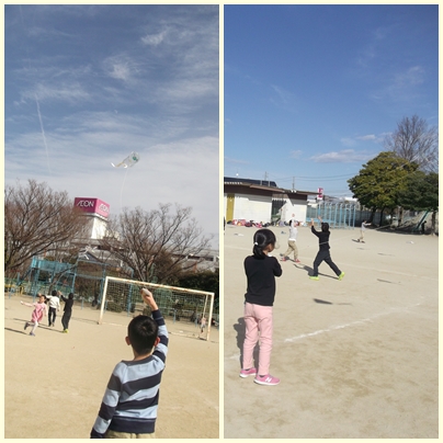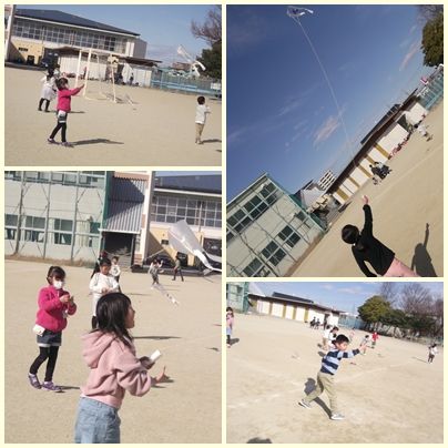 1年生が生活科の授業で作った凧をとばしていました。子どもたちが作った凧が北風をうけて青空に向かって空高く、気持ちよくあがっていました。