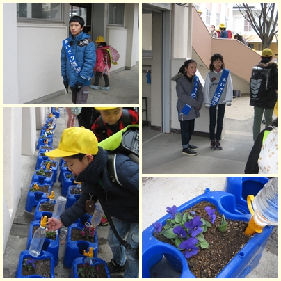 早朝のあいさつ運動がありました。PTAの委員さんも協力していただきました。寒い中、ご協力ありがとうございました!1年生の子どもたちは、登校したらすぐに、生活科で育てているビオラとチューリップの水やりに行きます。空気が乾燥しているせいか、培養土はかわいています。チューリップの芽がだいぶ大きくなってきました。春がすぐそこまできている感じがします!