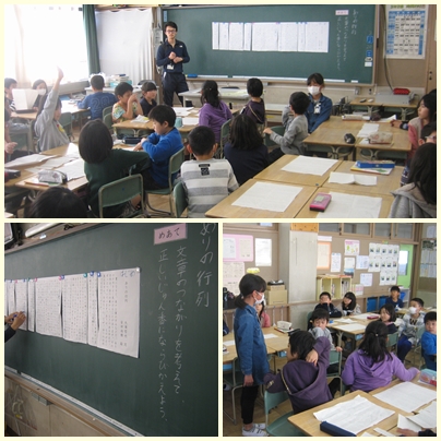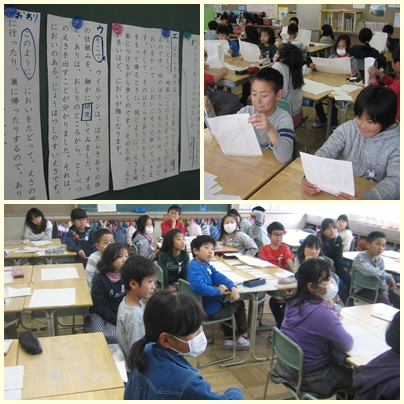 3年生が国語の授業で説明文「ありの行列」の段落を正しい順番に並べ直す学習をしていました。「問い」から「答え」までの考えの進め方を、段落のつながりに気をつけて読み取っていないと、正しい順番に段落を並べ直すことはできません。グループで話し会いながら、並べかえていました。