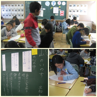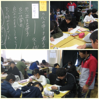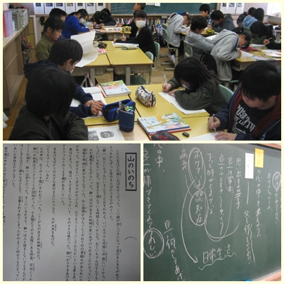 6年生が国語の授業で物語文「海の命」の作家、立松和平氏の児童向けの物語である、「山のいのち」を学習していました。今日は2時間目だということです。静一と祖父の心の中を読み描いていました。
