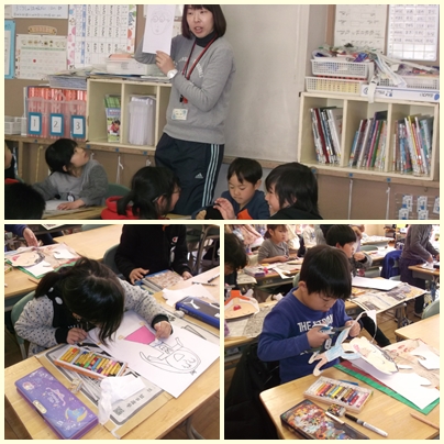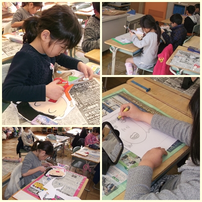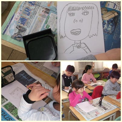 1年生が卒業式に体育館に掲示する自分の顔を描いています。どの子も鏡を見ながら一生懸命描いています。自分の顔に似ているかなあ?