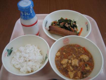 マーボー豆腐・春巻き・わかめの中華あえ・麦ご飯・牛乳