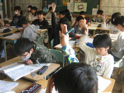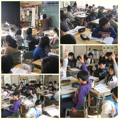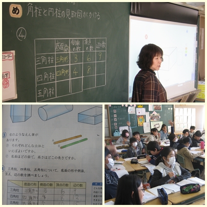 5年生が算数の授業で角柱と円柱について学習していました。三角柱・四角柱・五角柱の底面の形や側面、頂点、辺の数を調べていました。この後、三角柱と円柱の見取図をかきます。