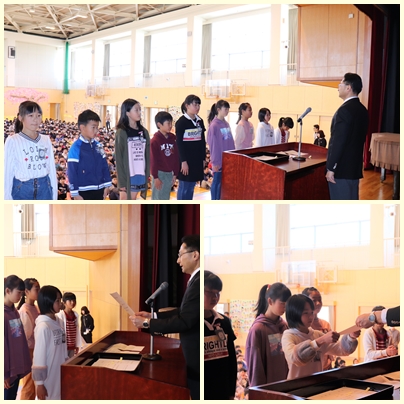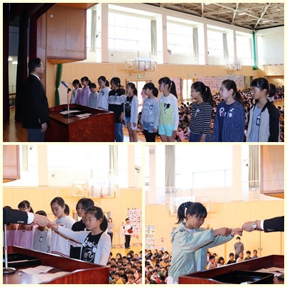 本日、早朝の学校集会で前期計画委員と前期委員会委員長、前期学級委員の任命式を行いました。任命状を渡された児童は、学校や学級のリーダーとして活躍を期待しています。