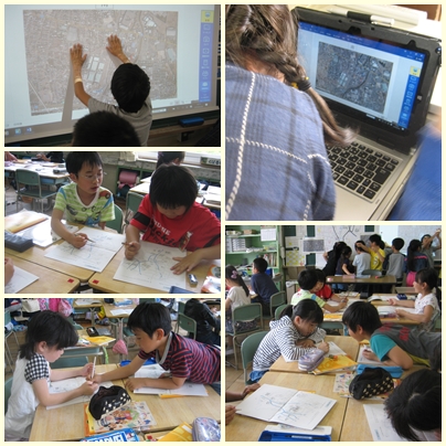 3年生が社会科の授業で米野小学校区の地図作りを行っていました。校区の航空写真を見ながら、地図作りをしていました。