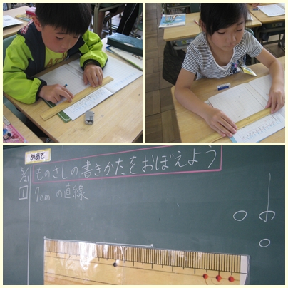 2年生が算数の授業で30センチものさしを使って直線のかき方を学んでいました。7センチ、8センチ、12センチ5ミリなど様々な直線をかいていました。