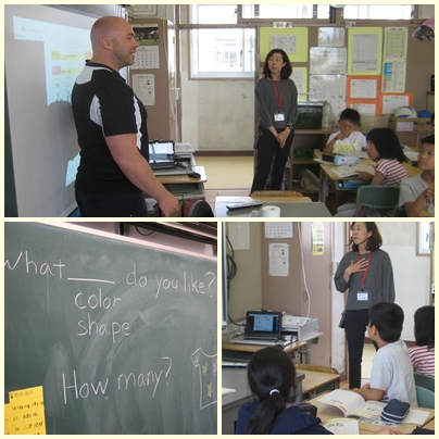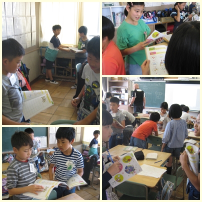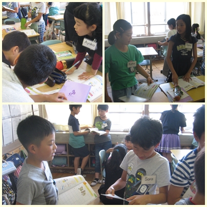 5年生が英語の授業で「What color do you like?」「I like 〜.」「How many?」の会話文を学んでいました。相手を変えて、英語でどんどん質問していました。