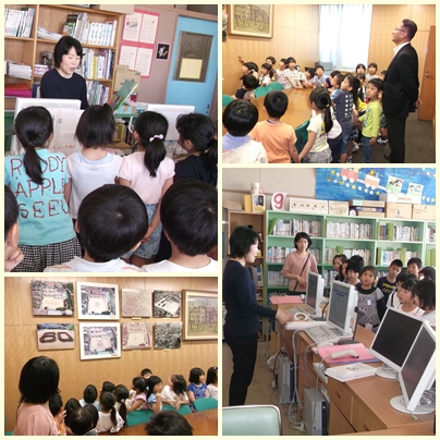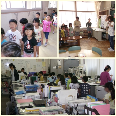 5月23日(木)2・3時間目に1年生が学校探検をしました。今日見学した場所は、配膳室、相談室、職員室、校長室、図書室(本の森)の5箇所です。それぞれの場所で配膳員の方から、心の相談員の方から、校長先生から、司書の方からお話を聞いたり、質問して答えてもらったりしました。
