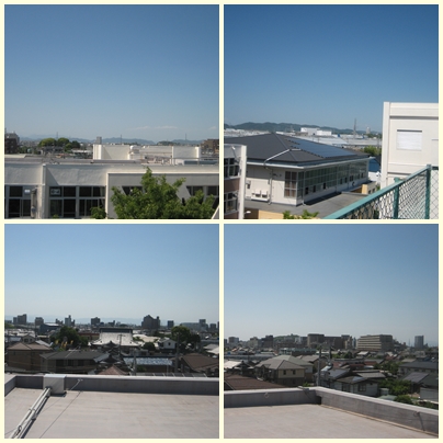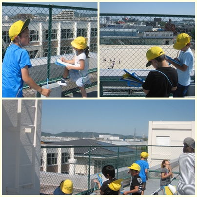 2年生の生活科で校区探検をして、見つけたことをまとめるために屋上から校区をながめました。今日は天気がよかったので、遠くまで見渡せました。