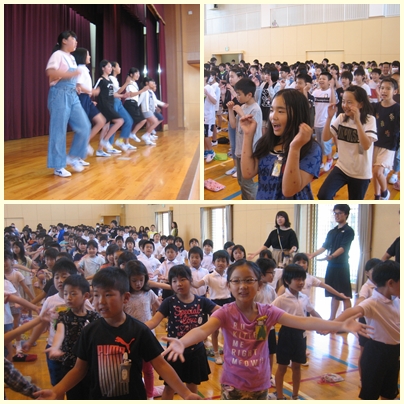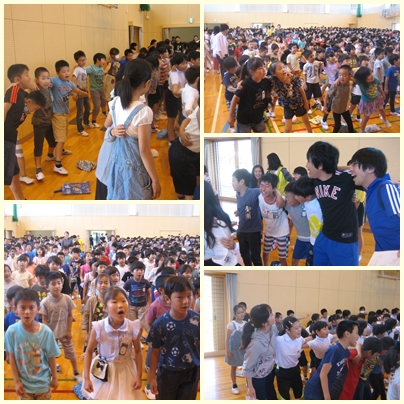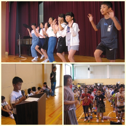 5月24日(金)早朝、歌声集会が体育館でありました。計画委員会の児童が舞台の上で全校児童をリードして、全校で今月の歌「世界中の子どもたちが」を合唱しました。歌声が体育館に響き渡りました。