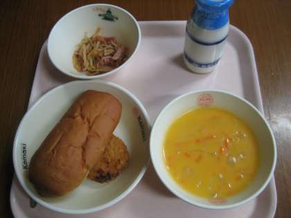 <献立> キャロットポタージュ・れんこんサンドフライ・もやしナポリタン・くろロールパン・牛乳