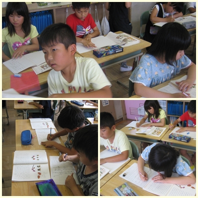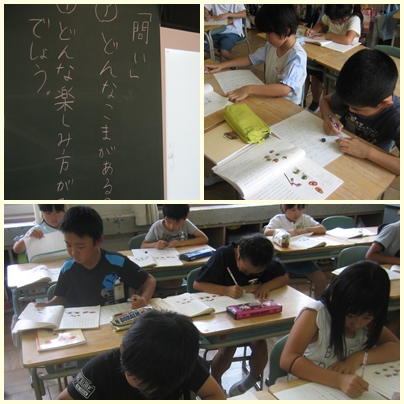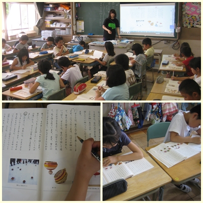 3年生が国語の授業で説明文の読み取りをしていました。どんなこまか、どんな楽しみ方をするのかの問いに教科書をよく読んで答えていました。