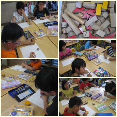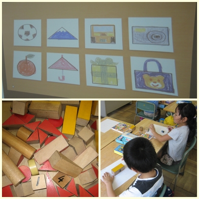 1年生が算数の授業で様々な形の積み木を使って、積み木の形をうつして絵をかいていました。まる、しかく、さんかく、色々な形を写し取りました。