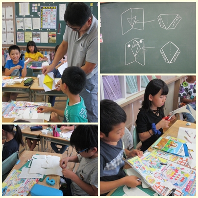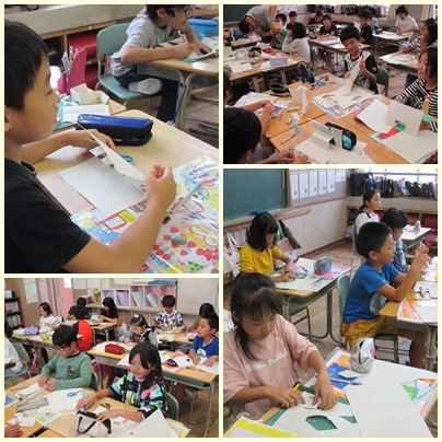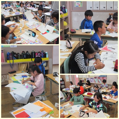 4年生は、図工競技会で動いたり、とびだしたりする仕組みを使って楽しいカードづくりをします。図工競技会に向けて「幸せを運ぶカード」を試しに作っていました。どんな仕組みができるのか試していました。