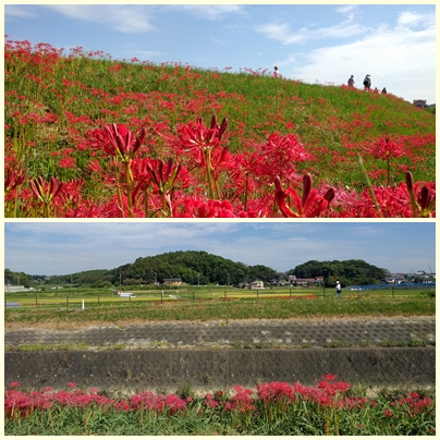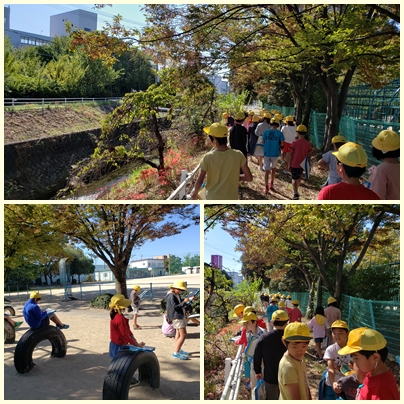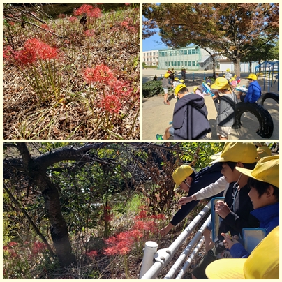 4年生が理科の授業で涼しくなって植物や動物の様子は、夏の頃と比べて、どのように変わっているのか学校の中や周辺を観察しました。植物の葉の色が変わったり、葉が枯れ落ちたりしていました。彼岸花もきれいに咲いていました。一番下の景色は、秋の校外学習で行く、新美南吉記念館の近くの土手の様子です。秋本番です!