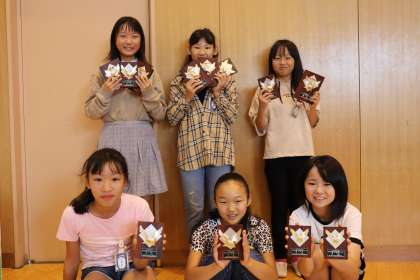小牧市民体育大会陸上競技の部で優秀な成績を収めた児童の表彰伝達が終わってから、みんなで記念写真をとりました!