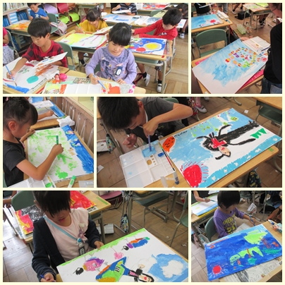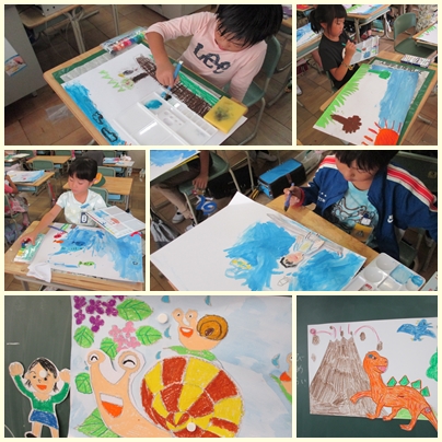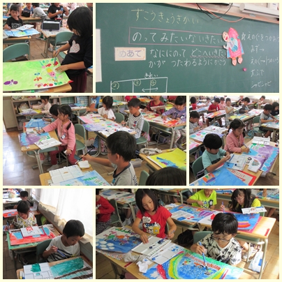 1年生は、図工競技会で「のってみたいないきたいな」という単元で、何に乗ってどこに行ってみたいか、自由に想像しながらかきました。