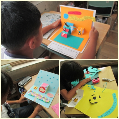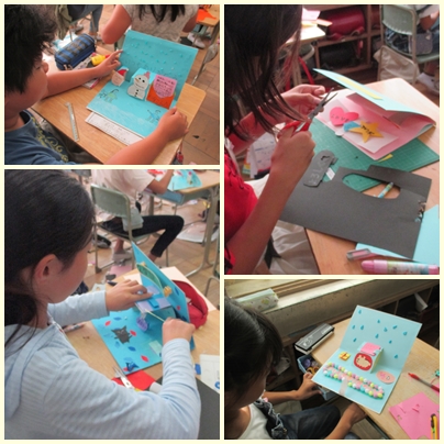 4年生は、図工競技会で「幸せを運ぶカード」を作っています。どの子も熱心に、飛び出す仕組みを工夫して作っていました。
