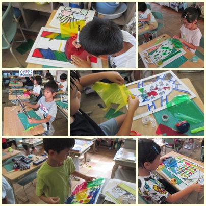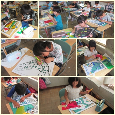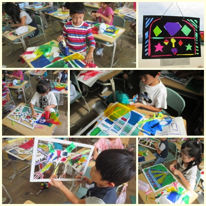 2年生は、図工競技会で「ひかりのプレゼント」を作っています。カッターナイフを使って紙を切り、切ったところに色セロハンをはって、壁飾りを作ります。子どもたちは、随分、カッターナイフの使い方が上手になってきました。