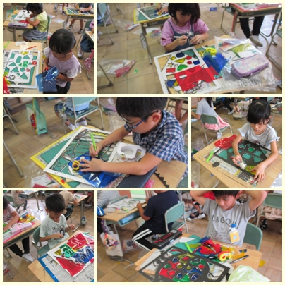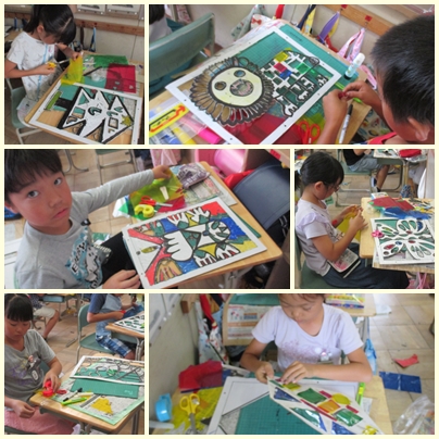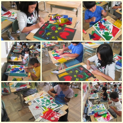 2年生は、カッターナイフをうまく使って、壁飾りを作っています。