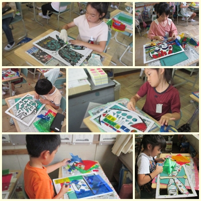 2年生は、図工競技会でカッターナイフで紙を切って、色セロハンをはりつけながら、「ひかりのプレゼント」を作っています。あと少しで完成です!