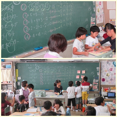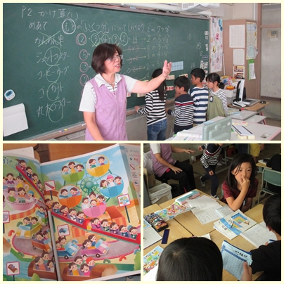 2年生が算数の授業で3この4つ分とか5つの3つ分、2この5つ分という言い方を学んでいました。かけ算の導入の学習です。これから九九を学んでいきます。