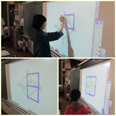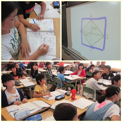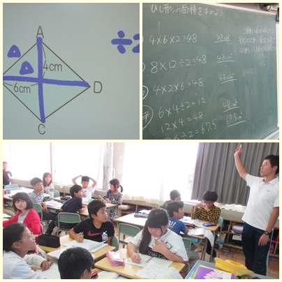 5年生が算数の授業でひし形の面積を求めていました。色々な解き方がありました。三角形や長方形の面積の公式を使って求める方法などです。ひし形の面積の公式も導き出しました!