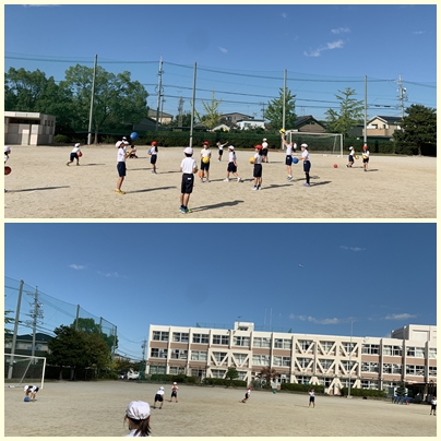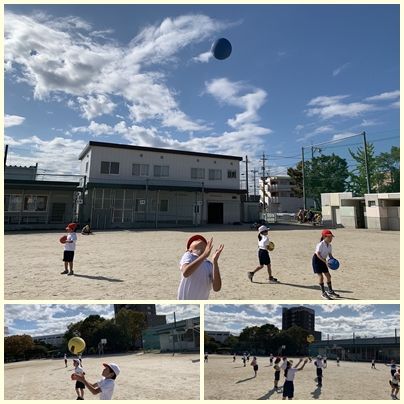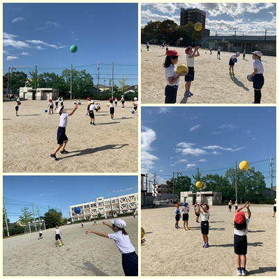2年生が体育の授業でボール遊びをしていました。さわやかな秋空の下、ボールを空高く投げ上げてとても気持ちよさそうでした!