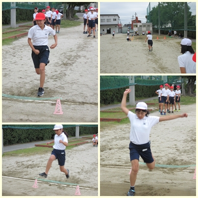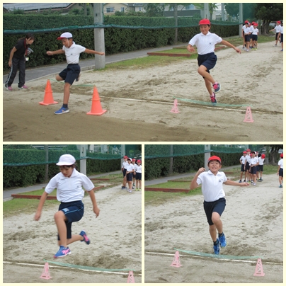 5年生が体育の授業で、走り幅跳びの学習をしていました。走るスピードをうまく跳ぶ動作につなげないと遠くへ跳べません。どの子も苦労していました。
