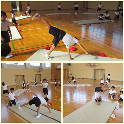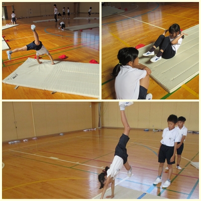3年生がグループにわかれてマット運動を行っていました。側転や後転の練習をしていました。