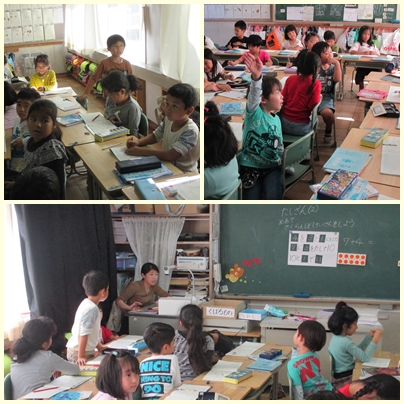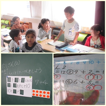 1年生が算数の授業で繰り上がりのあるたし算の仕方を学んでいました。7+4の計算の仕方です。さくらんぼ計算をするということです。4を3と1にわけて計算します。