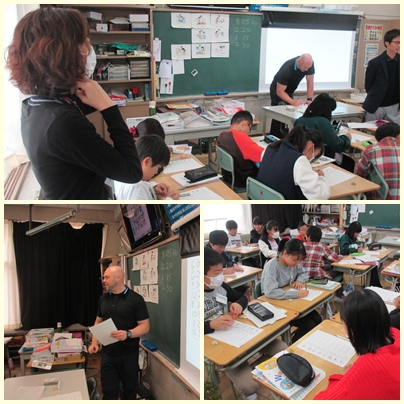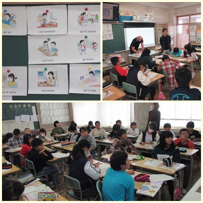 6年生が英語の授業で「What time do you get up?」「I get up at six.」で答える会話文を学んでいました。